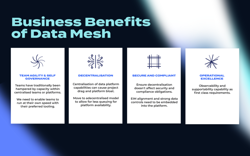 The key take way – a Data Mesh allows for flexibility and self-governance of projects for large organisations looking to deliver data outcomes at pace. The diagram below sets out the business benefits.